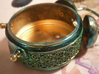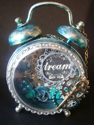 I managed to get the clock back together without the insides (whew) and then I used my alcohol ink to color the clock. I then used some sand paper to bring back some of the color underneath. I thought it needed something else so with my fingertip I rubbed some silver paint over parts and it really looked great on the raised parts.