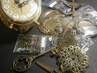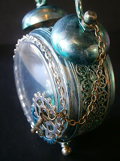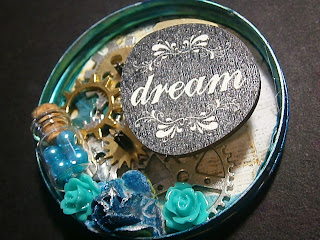 Below you can see that I lay some pattern paper down and went about adhering some cogs from Faiths store. I used alcohol ink on some of them and the glue I used was E6000. The wood icon I used was from the Epiphany collection. I used a Prima flower I colored with alcohol ink and silver paint and a couple of resin roses and a wee bottle with some tiny pearls in it.
