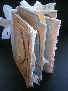 I covered the base using the designer papers. I used the journaling spaces on the cut apart pages to tuck into the pockets and fancy up some tea dyed tags.